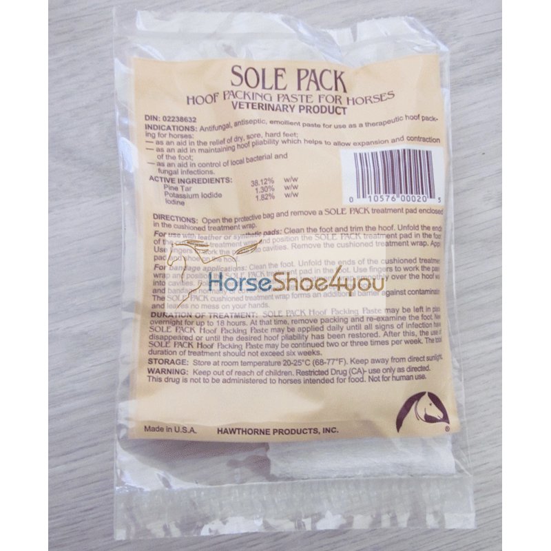 Sole Pack Hoof Packing entlastet trockene, harte, schmerzende Hufe und bekämpft Bakterien- und Pilzinfektionen. Es behandelt auch die Krankheit "White Line Disease". Sole Pack Hoof Packing ist äußerst effektiv bei der Erhaltung der natürlichen Geschmeidigkeit des Hufs. Sole Pack Hoof Packing ist schnell wirkend, schnell einziehend und mit beruhigenden natürlichen Inhaltsstoffen versehen. Sole Pack Hoof Packing ist als praktisches, benutzerfreundliches individuelles "2g Päckchen" und die günstigere 3,6kg -Menge erhältlich. Die einzigartige Fähigkeit, den Huf wieder in einen natürlichen Zustand zu bringen, macht es effektiv, egal ob es sich um einen zu weichen Huf oder einen zu harten Huf handelt.